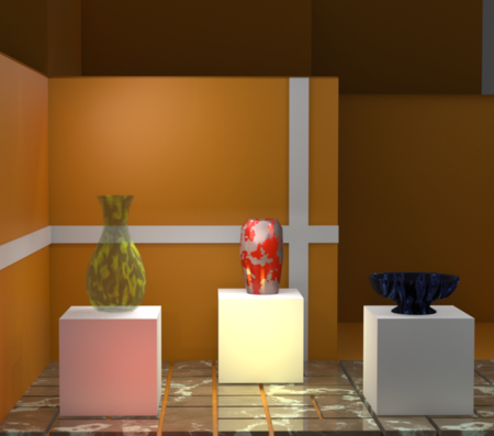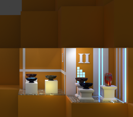 (1) Вид ваз: желтая — стекло, красная — железо, синяя — дерево (2) вид зала с номером