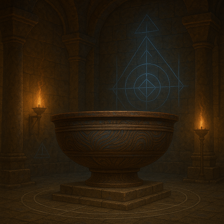 (3) Ancient ceremonial futuristic shrine, a wide, low wooden ceremonial vase, shaped like an ancient fruit bowl, placed in the center of a sacred ritual chamber. The vase is made of dark aged wood with visible natural grain and carved relief patterns, but subtly tinted with shades of blue — as if the wood has absorbed ancient mineral pigments or faded ceremonial paint. Light blue tones softly highlight the grooves and texture of the wood, creating a mystical, cold contrast against its warm brown base. Some areas show a faint bluish patina, like sacred residue from forgotten rituals. The atmosphere is dramatic, ancient and epic: dim warm firelight mixed with cold blue ritual glows, orange stone walls with white geometric markings, dust in the air and heavy silence. The bowl feels sacred, worn by time, created for offerings to lost gods.