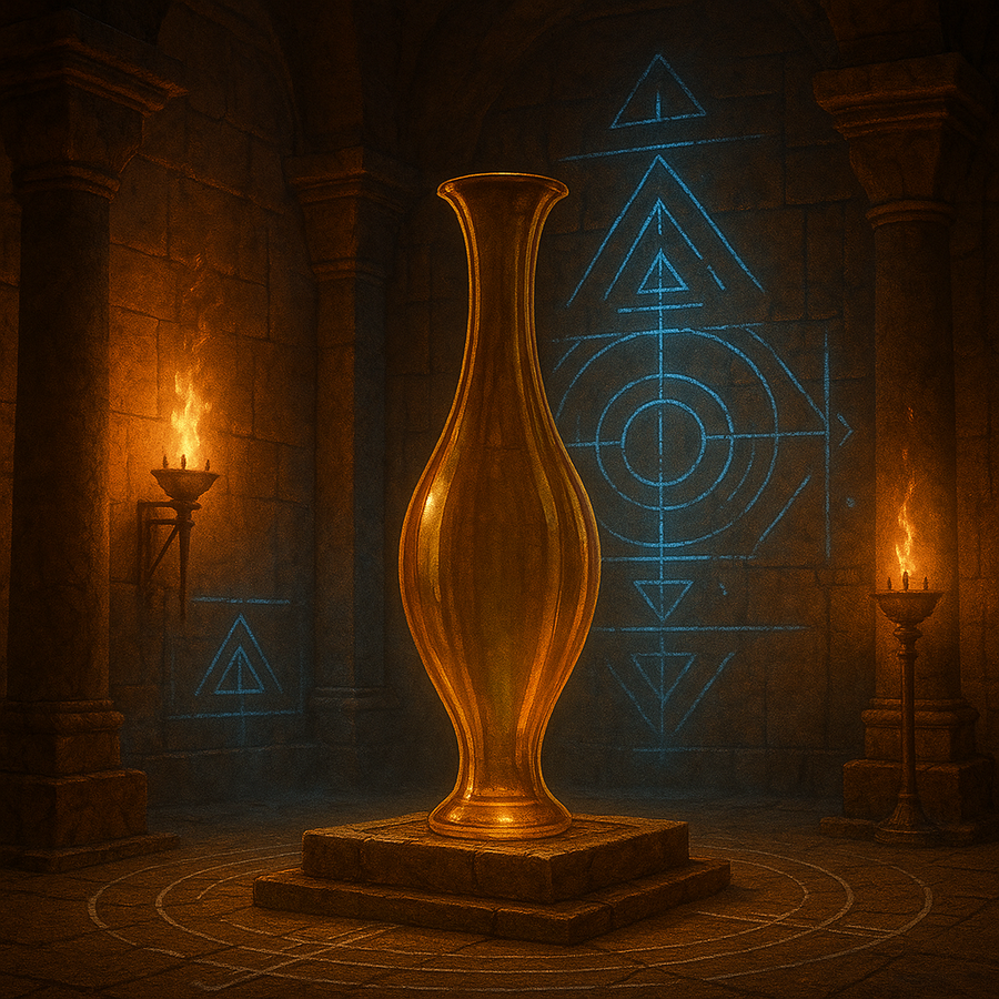 (1) Ancient ceremonial futuristic shrine, a tall, elegant glass vase stands at the center of an ancient ceremonial chamber. The vase is transparent, fragile and delicately shaped, with thin crystalline walls that catch soft reflections of light. The atmosphere around it is dramatic and sacred — dim warm light from torches and cold blue ritual glows illuminate the orange stone walls and white geometric markings. The space feels epic and timeless, filled with silence, tension and reverence.