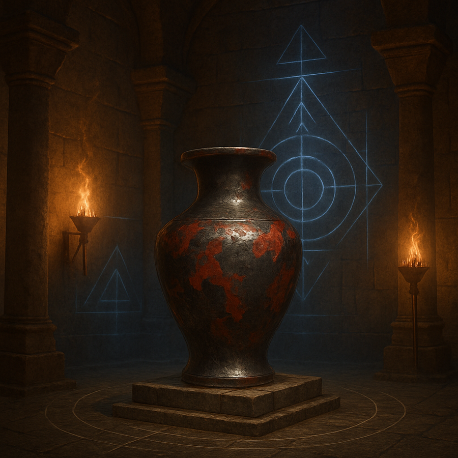 (2) Ancient ceremonial futuristic shrine, a solid iron ceremonial vase stands at the center of an ancient ritual chamber. The vase is short and thick in shape, heavy and resilient, covered with worn red paint. In many areas the paint has peeled away irregularly, revealing patches of shining steel beneath — a raw, weathered, battle-scarred surface. The glossy metallic parts catch faint light, while the remaining red paint looks aged, cracked and matte. The atmosphere is dramatic, ancient and sacred — dim mixed with cold ritual glows reflects off the rough iron surface. The chamber around is built of warm ochre stone and white geometric lines, filled with dust, silence and tension, as if this iron relic was once used in forgotten rites of blood and fire.