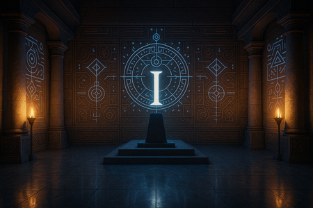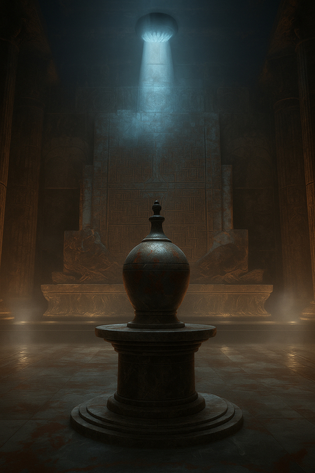The impressive interior of the ancient temple in the style of futurism. In the foreground is a single ceremonial pedestal with a ritual vase, softly illuminated from below. From below, the atmosphere is gloomy, sacred, and hazy. In the background, a massive stone wall is visible, covered with ancient geometric patterns, without text or symbols. The ornament glows faintly with a cold blue or soft golden light, like a forgotten language or a temple code. The lighting is cinematic: warm light from below and subtle blue highlights from wall decorations. Marble or stone floor with reflections, deep shadows, without symbols, logos or names. The atmosphere is epic, mysterious and ritualistic.