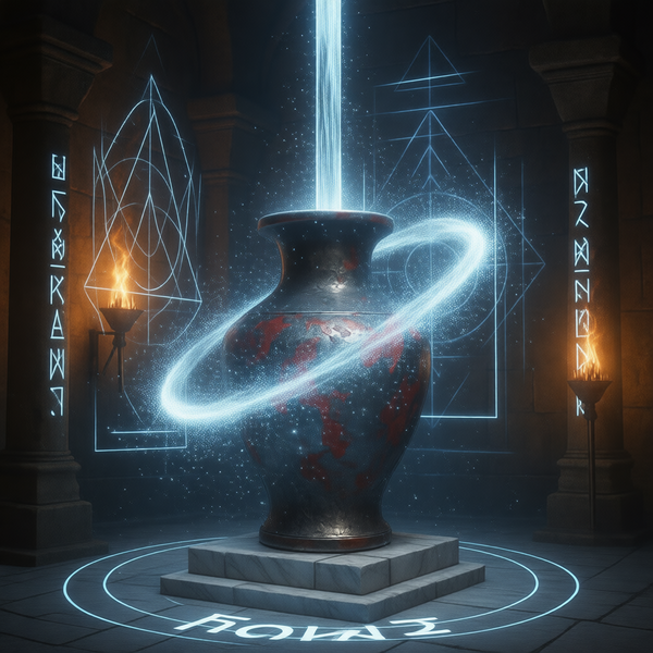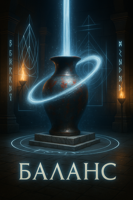 3D cinematic poster of an ancient futuristic ritual chamber. In the center stands a stone or ceramic jug on a marble pedestal. Clear water is being poured into the jug from above, the stream shimmering in soft torchlight and cold blue glow from sacred geometric symbols carved into the warm ochre stone walls. A mystical swirling vortex of air and light begins to form around the jug, lifting dust and glowing particles — as if the ritual is being awakened. The marble floor is reflective, the atmosphere is silent, sacred and tense. Intricate glowing patterns and runes on the walls, columns on the sides partly in shadow. The word «Баланс» subtly integrated in the scene or at the bottom in ancient mystical font. Soft contrast of warm firelight and cold white-blue glow. Highly detailed, atmospheric, 9:16.