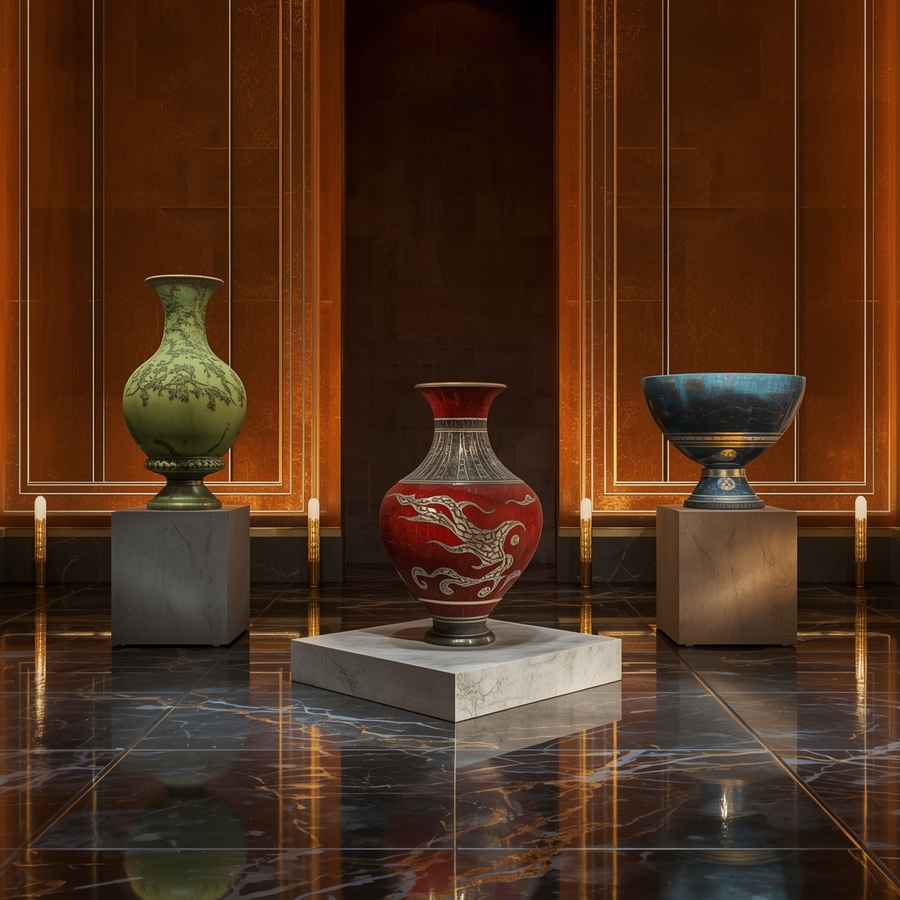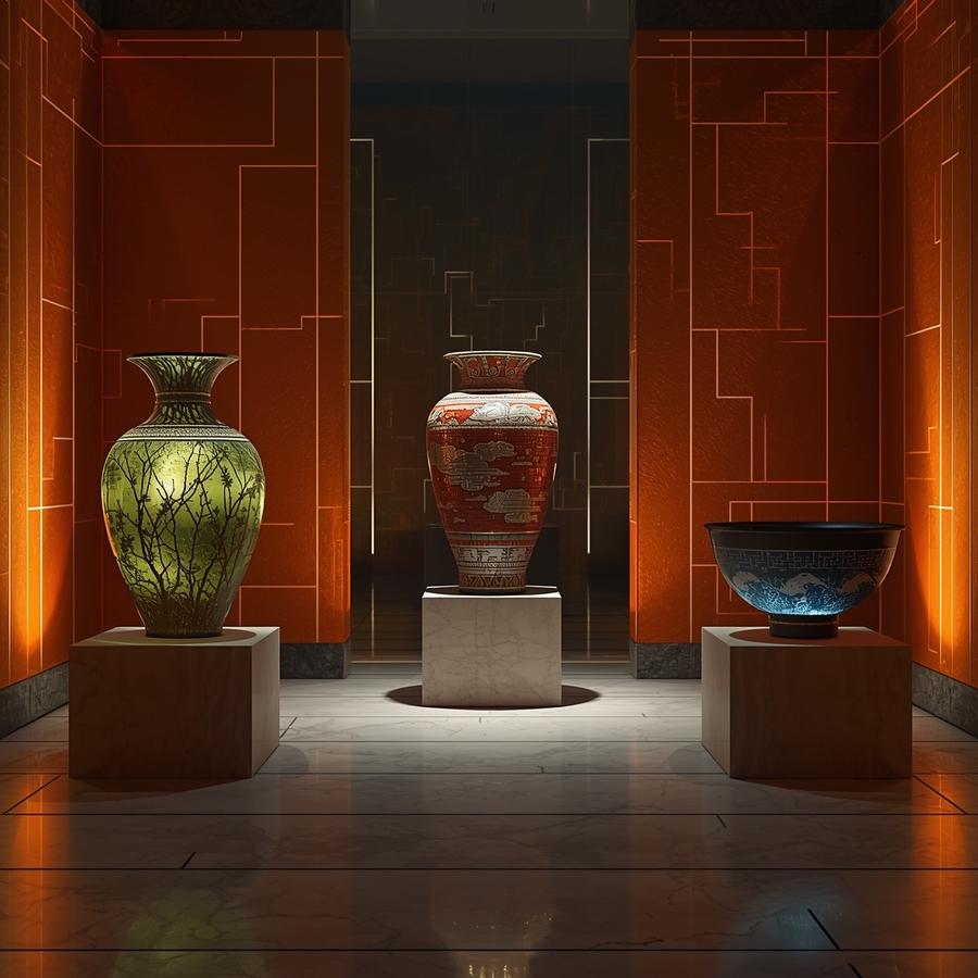 A dimly lit ritual chamber with warm orange and bronze walls, accented by white geometric lines. Three ancient ceremonial vases stand on white stone pedestals: the left vase is translucent green with organic moss-like patterns, the middle vase is red and silver with ancient cloud motifs, and the right bowl is deep blue with subtle glowing designs. The floor is made of polished marble slabs with reflections of soft golden light. The atmosphere is dramatic, sacred, and mysterious — like an ancient gallery preserved for centuries. Add realistic lighting, cinematic shadows, and ancient textures on the pottery. Keep all original colors unchanged.