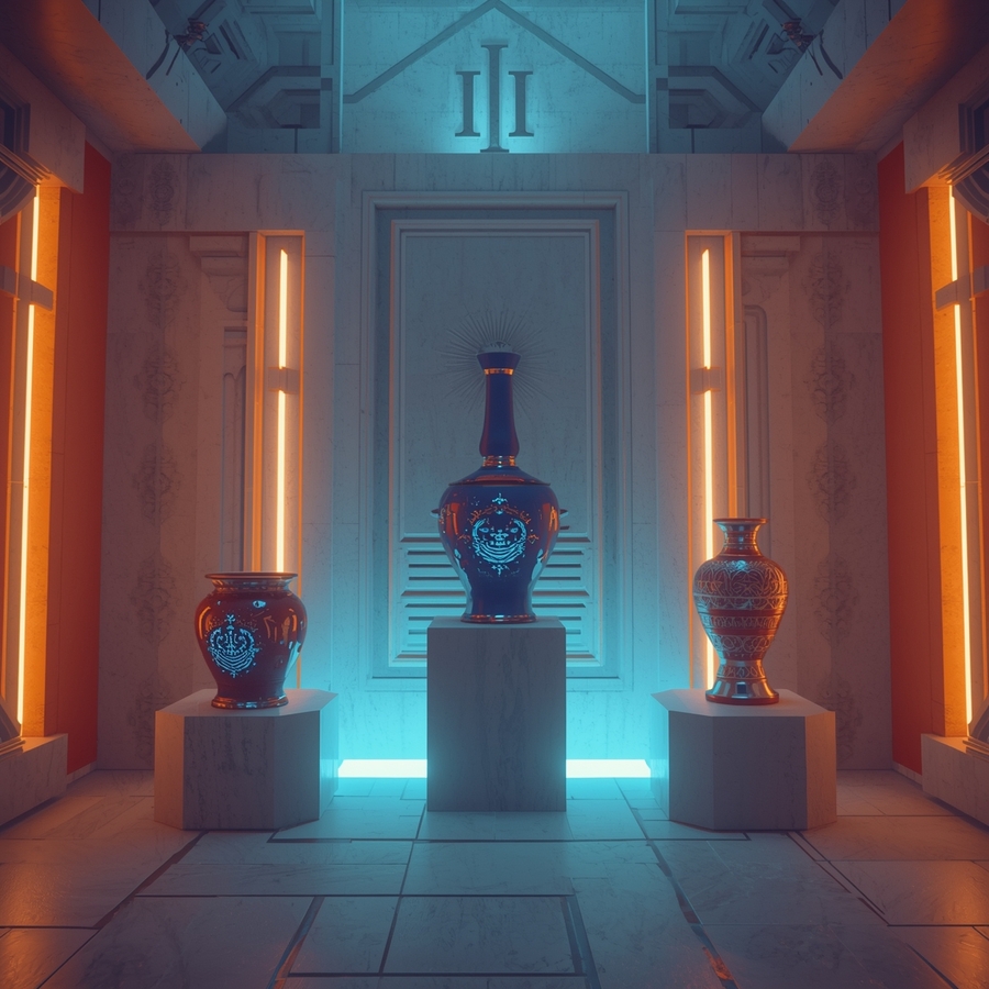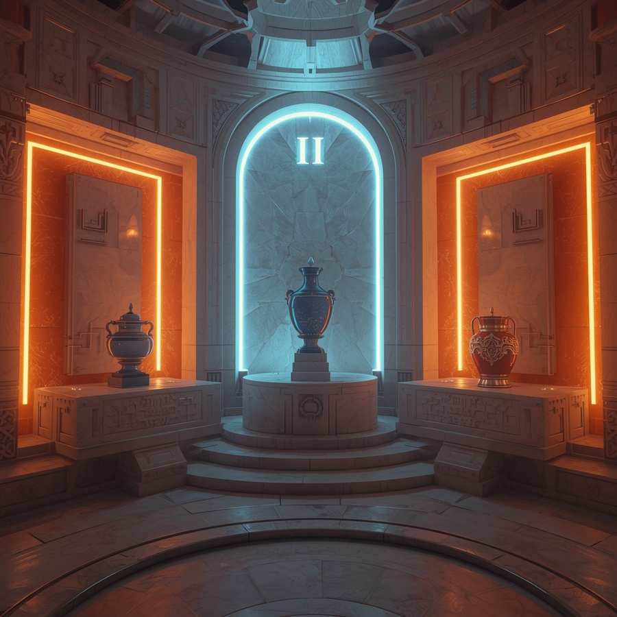A sacred chamber illuminated by soft blue and amber light, featuring three ancient ceremonial vessels displayed on white stone pedestals. The left and center vessels are deep blue with subtle glowing patterns, and the right vase is red and silver with intricate motifs. The walls are orange and white with geometric architectural elements and glowing vertical light lines. A Roman numeral «II» is engraved above, suggesting a ritual hall or section of an ancient archive. The atmosphere is mystical, solemn, and cinematic — blending futuristic design with archaeological reverence. Keep the same colors, enhance the textures and lighting, and add a sense of ancient history and quiet ritual.