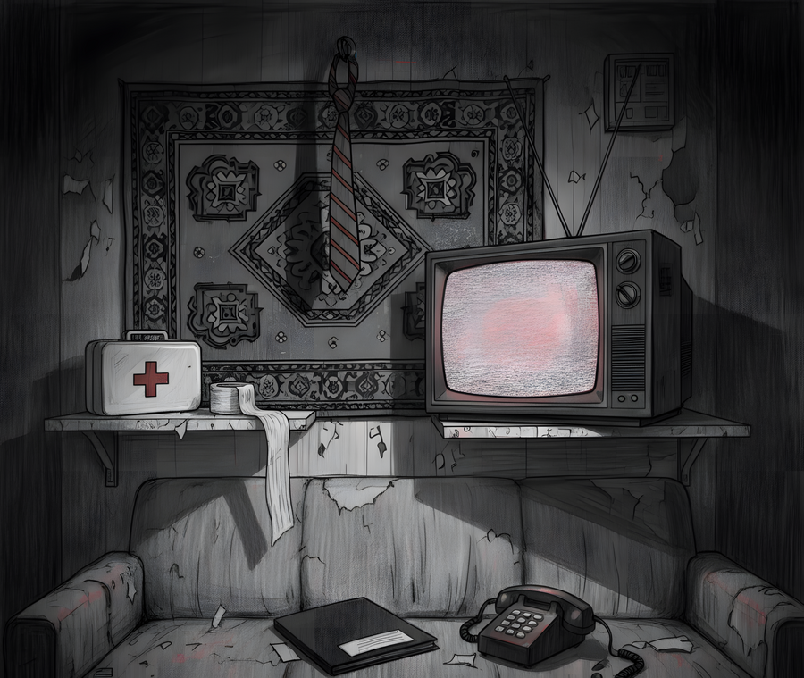 Interior of a 1990s Soviet apartment, old CRT TV, carpet on the wall, dim lighting. A tie is hanging from the ceiling, a first aid kit and bandage on the shelf, a black document folder and push-button phone on the sofa. Scene in the style of a visual novel, black-and-white palette with red accents, high contrast, pencil sketch effect. Atmosphere is gloomy, eerie, psychological horror, art game aesthetic.