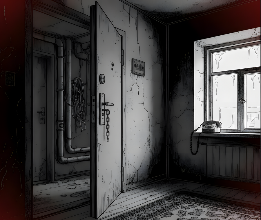 Black and white comic-style illustration with red accents, similar to a visual novel scene. Halftone shadows, dramatic lighting, slightly gritty, noir atmosphere. Depict the interior of a Soviet or post-Soviet apartment: a heavy metal door is open, showing a dimly lit stairwell or hallway with pipes and old wiring. The door has a peephole, locks, and a chain. Inside the apartment, there is a window on the right side, with an old button phone lying on the windowsill.