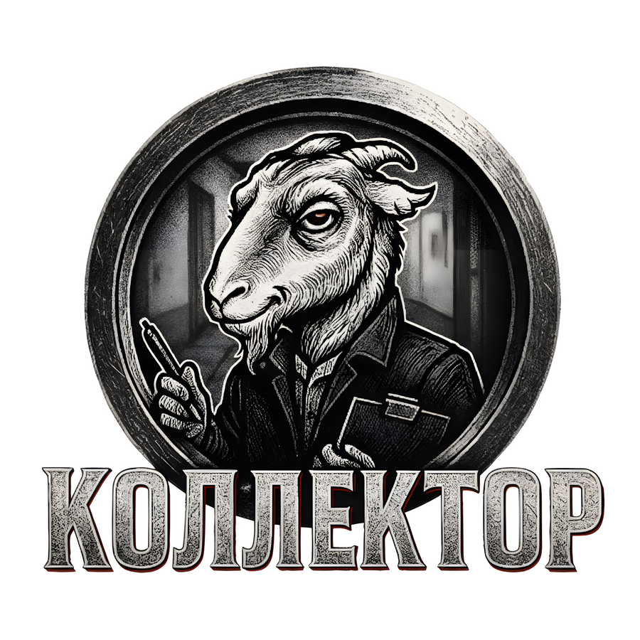 Vintage logo design, a goat in a business suit holding a pen and clipboard, engraving or etching style, serious expression, circular coin-like frame background, black and white detailed illustration with red accents, bold text «КОЛЛЕКТОР» at the bottom, retro poster design, strong contrast and lighting.
