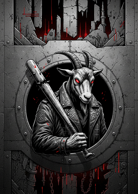 Black and white vertical illustration, featuring an anthropomorphic goat in a 1990 Soviet criminal style jacket, holding a baseball bat seen through a round metallic frame or porthole. The background is slightly blurred for depth. The entire scene is monochrome, except for vivid red eyes and small red highlights for dramatic contrast. The atmosphere is dark, gritty, and psychological, with high contrast lighting and detailed texture on the leather background. Style of graphic novel or dark aesthetic, cinematic composition, focused perspective.