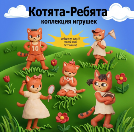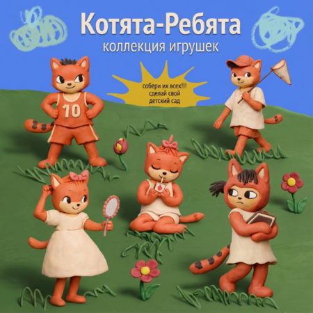 Игрушки-фигурки антропоморфных ребят-котят. Каждый из них чем-то занят, кто-то бежит читать новую книжку, кто-то пьет любимый сок, а кто-то собирается ловить бабочек. Фигурки по типу тех, что когда-то попадались в киндер-сюрпризе.