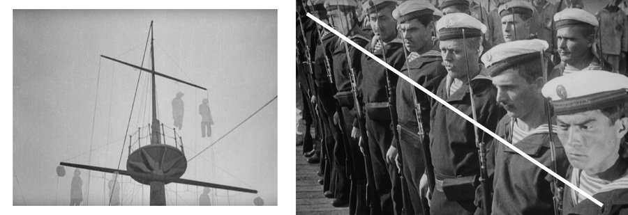 Диагональ создаёт ощущение смещения, агрессии, резкого движения. В массах на лестнице тело толпы — это «падающая плоскость», набирающая силу.