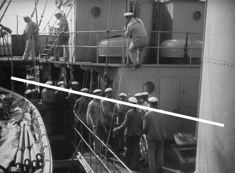 Горизонтальные композиции создают ощущение разлёгшейся силы. Матросы становятся ритмической полосой, в которой каждый элемент поддерживает форму общего. Так горизонталь «успокаивает», но при этом делает изображение монолитным