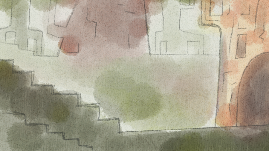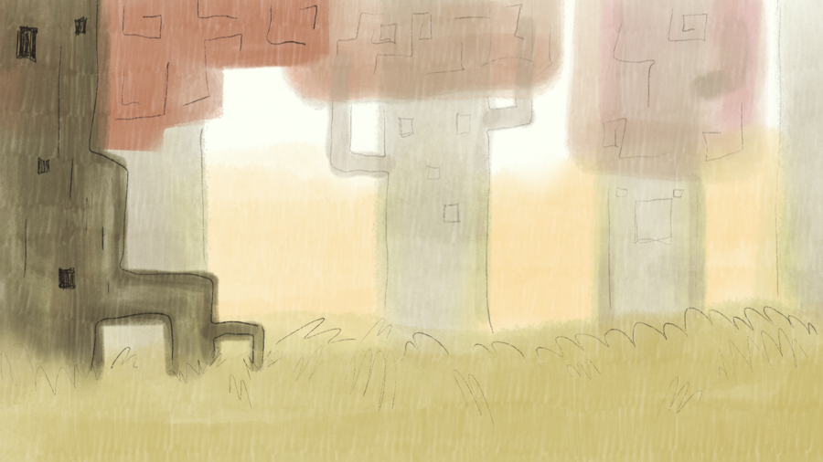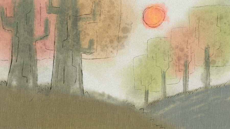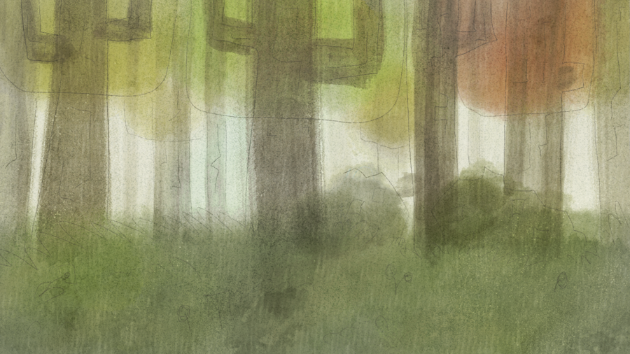 Финальные эксизы дневного леса: текстурная карандашная акварель блёклых тонов с тонким лайном