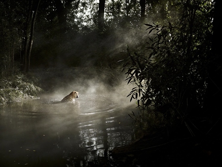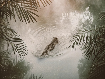 a leopard drowning in the water. He is drowning in a lake in the misty jungle. the camera is on top