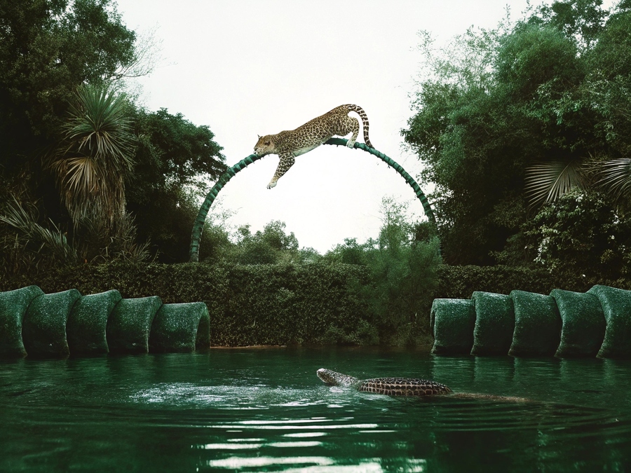(1) a leopard jumping on grass blocks above the ground, a crocodile swimming in the water below it