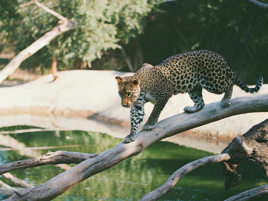 (2) a leopard walking through the branches of trees. The trees are in the water, and the leopard is on the branches above it. A leopard runs past huge snakes. which come out of the earthen holes above the leopard’s head