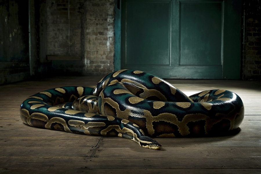 (2) A highly stylized 3D render of a sleek, abstract large snake sculpture (like a python or anaconda) coiled elegantly or in a dynamic striking pose. The figure has a high-gloss, reflective surface texture with a complex, iridescent scale pattern in shades of dark green, brown, and golden ochre, resembling polished serpentine scales, lacquered wood, or metallic finishes. Emphasize the muscularity and fluid form. Studio lighting, high detail, volumetric shadows