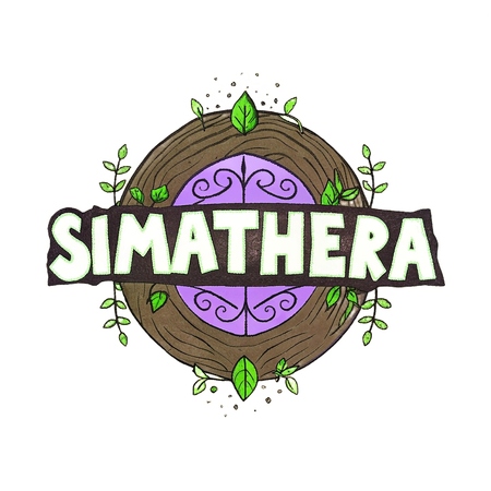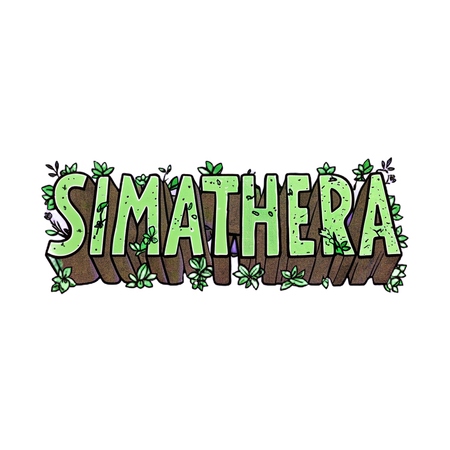 (1) A white T-shirt centered with the fantasy-style «SIMATHERA» logo (from the user’s image: green leafy letters on a brown, wood-like background).