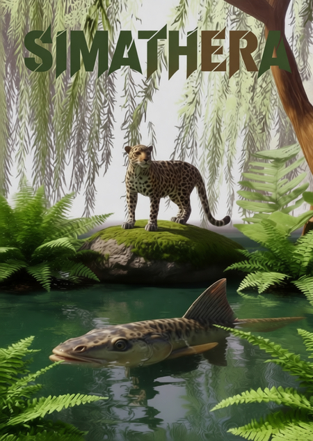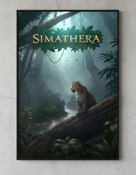 A captivating and highly stylized promotional poster for the game «SIMATHERA. Dark, moody, mysterious jungle environment with heavy mist/fog and dappled light (cinematic, high-fantasy style). Prominently feature the „SIMATHERA“ fantasy logo (green leafy letters on a wood-like base) at the top or center. Include a leopard (like the ones from the uploaded images—sitting by bars or swimming/drowning in the water) as a central visual motif, suggesting adventure and danger. Incorporate elements of water and lush jungle foliage/ferns (like the image with the fish and leopard) to establish the setting. Subtly hint at themes of exploration, mystery, and ancient ruins/confinement (referencing the images with the leopard near the bars/gate). A vertical (poster) orientation with dynamic lighting and rich texture. The overall feel should be epic and inviting to fantasy/adventure fans. Digital painting, cinematic render, or high-end game concept art.