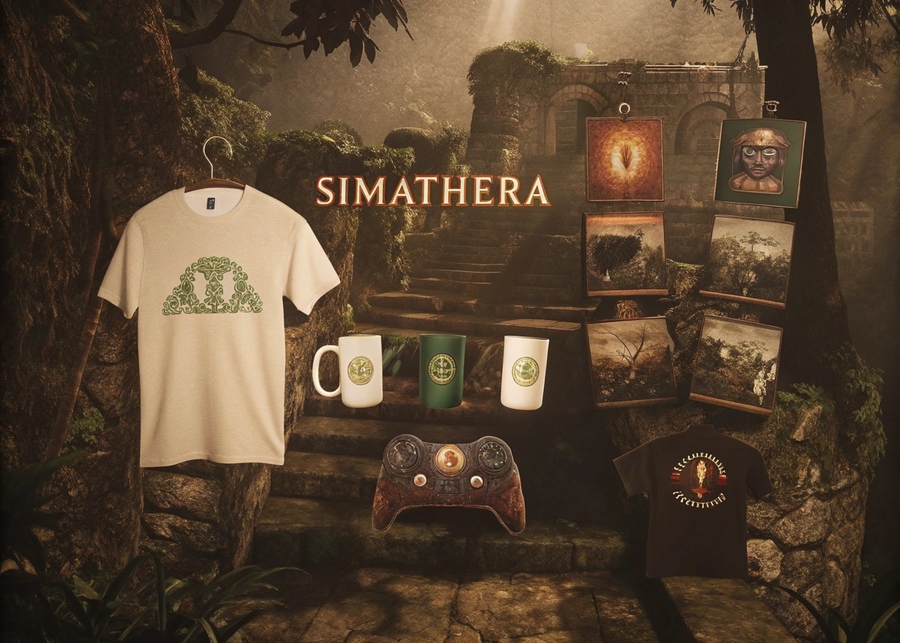 A visually appealing and immersive real / online storefront/marketplace for «SIMATHERA» game merchandise. Atmosphere: The aesthetic should seamlessly blend the game’s dark, mysterious jungle environment (mist, lush foliage, ancient ruins, dappled light) with a modern, clean e-commerce interface. Prominently display various «SIMATHERA» merchandise items: The white T-shirt with the «SIMATHERA» logo. The custom green and brown game controller with the logo. Other hypothetical items: mugs (perhaps leopard-themed or jungle-themed), keychains, posters, hoodies, mousepads, etc., all featuring the «SIMATHERA» logo or game art. Background/Setting: The merchandise should be tastefully arranged within or subtly superimposed on a backdrop reminiscent of the game’s world — perhaps moss-covered stone shelves, wooden display cases, or floating platforms amidst misty jungle ruins. Branding: The «SIMATHERA» fantasy logo should be clearly visible, integrated into the marketplace’s brand
