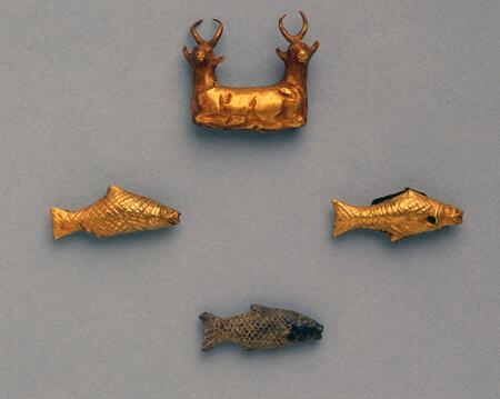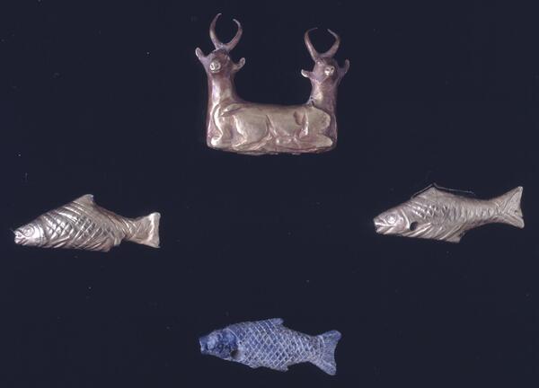 Золотой амулет в форме двух антилоп, соединенных между собой, найденный вместе с амулетами-рыбками на руке Пу-аби Онлайн-архив Британского музея