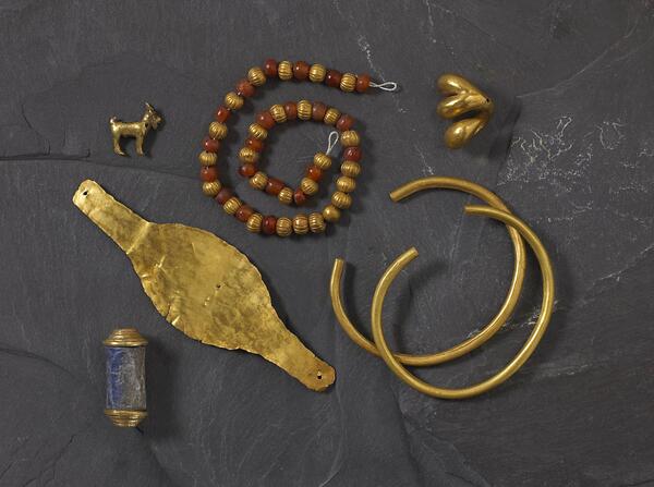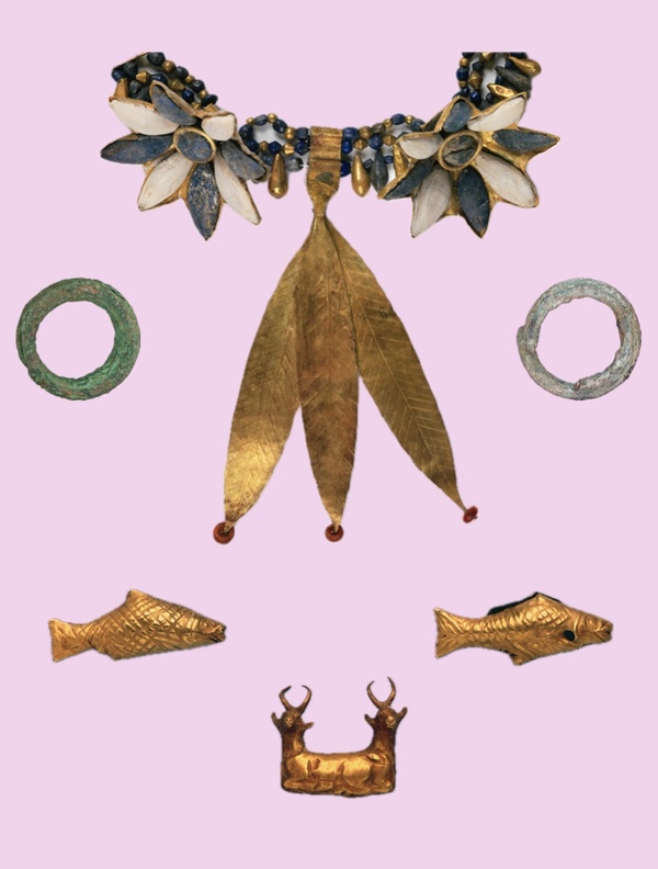 Слева: золотой многоэлементный браслет на руку, онлайн-архив Британского музея Справа: подвески (золото, серебро, битум), онлайн-архив музея Метрополитен