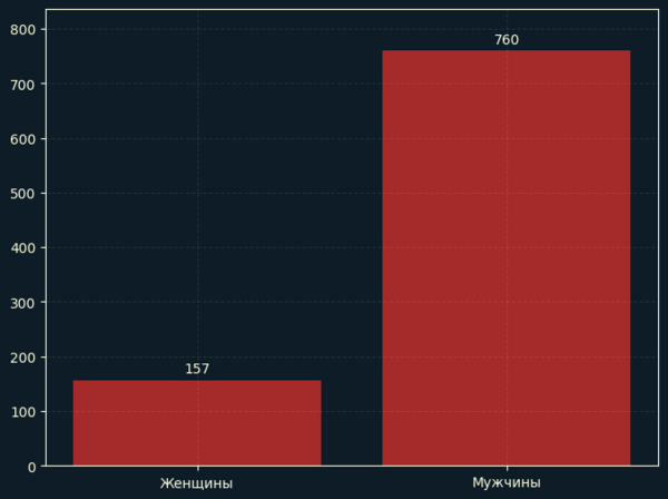 Выходит, что за 5 книг в серии умерло 917 персонажей! При этом виден колоссальный разрыв в смертности между мужчинами и женщинами, что неудивительно, ведь в мире Вестероса воюют в основном мужчины.