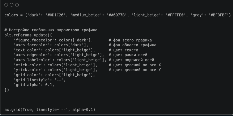Также пишем код, который подготавливает среду для визуализации данных в стиле, где фон и элементы графика выполнены в тёмных и бежевых тонах, улучшая визуальную эстетику и читаемость будущих графиков. Настройка глобальных параметров графика происходит с помощью plt.rcParams.update ()