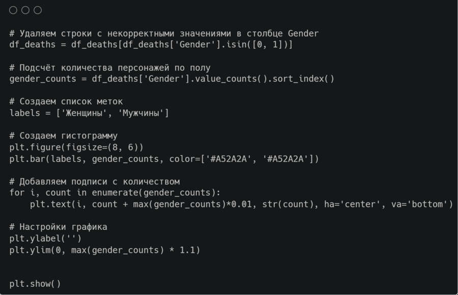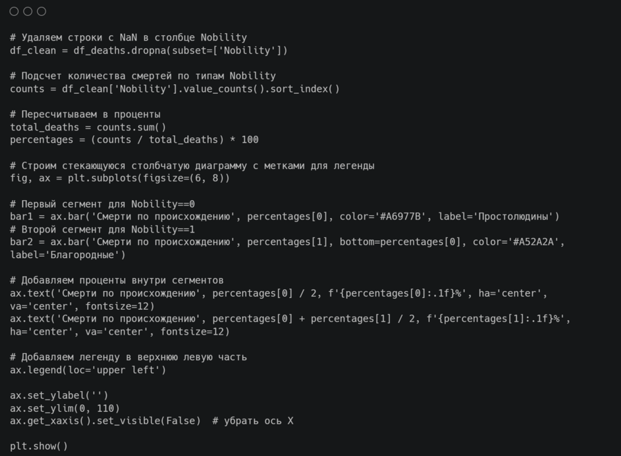 Для происхождения эффективнее показать сравнение в процентом соотношении на столбчатой диаграмме с накоплением, а для пола — в количестве на обычной гистограмме, которая заодно даст нам представление о числе всех смертей в книгах.