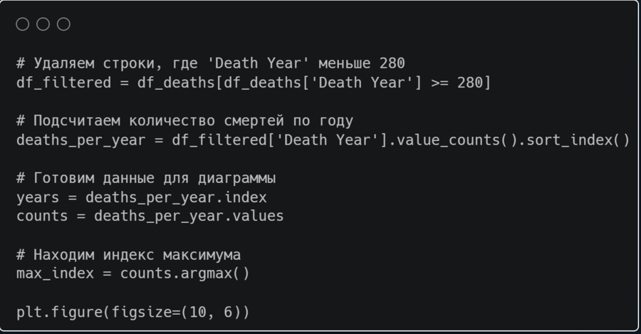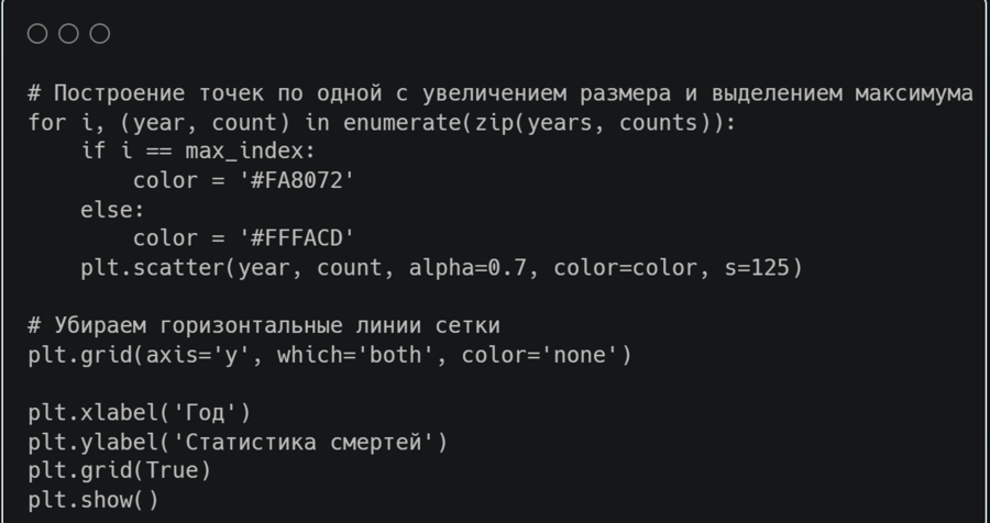 Теперь построим график рассеянной диаграммы для того, чтобы отследить смертность по годам. Я также добавила ограничение по датам, чтобы выделить наиболее релевантную информацию из столбца.