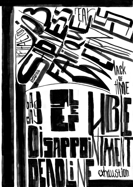Иногда проблем так много, что ты не знаешь, куда от них сбежать. Спасением является сон. Об этом повествует шрифтовая композиция. Сон — защита от внешних проблем.