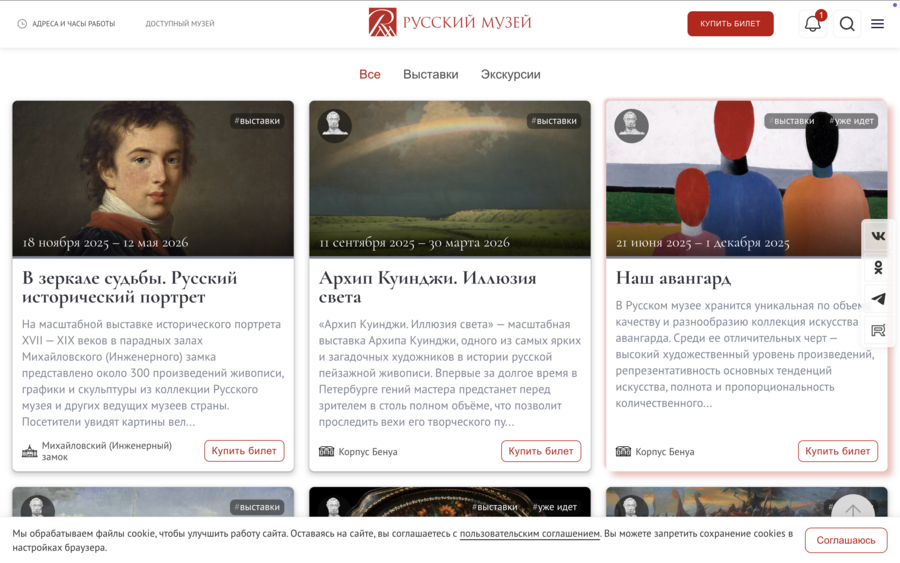 Современные сайты культурных институций уже давно перестали быть исключительно инструментом для покупки билетов или получения базовой информации. Сегодня они выполняют сложную, многослойную функцию: представляют выставки, создают визуальную интригу, формируют эмоциональное ожидание и становятся частью кураторской коммуникации. Пользователь, заходя на сайт музея, стремится не только решить практическую задачу — узнать расписание или приобрести билет, — но и понять, что его ждёт, какова концепция выставки и насколько интересным будет будущий опыт. Таким образом, сайт превращается в самостоятельное медиапространство, которое воздействует на зрителя ещё до его прихода в музей.