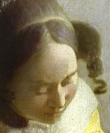 Из-за тонких мазков наброска, который покрывался множеством слоёв краски, мы не можем различить первоначальные линии. Но на данном фрагменте картины видно, как Вермеер доходил до контура, но не перекрывал его.
