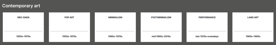 Но в более строгом смысле понятие contemporary art является синонимом постмодернизма и охватывает период с окончания Второй мировой войны до сегодняшнего дня.