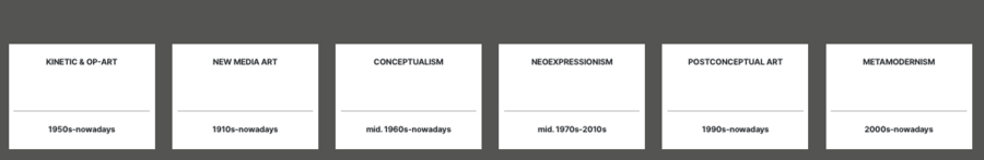 Живой художественный процесс довольно трудно уложить на прямую линию таймлайна не только потому, что многие течения развиваются одновременно, но и потому, что в разных регионах схожие события разнесены во времени. Например, «московский концептуализм» возникает спустя примерно десять лет после концептуализма Кошута и ЛеВитта. Можно сказать, что только в 2000-х мир искусства становится по-настоящему глобальным.