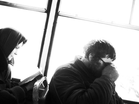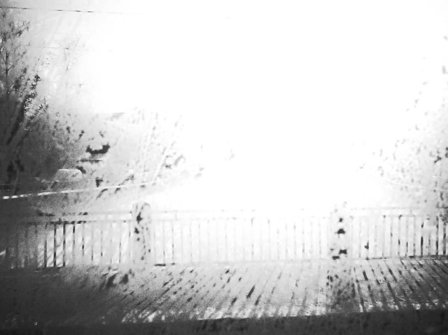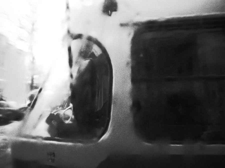 Запотевшее стекло автобуса проявляет накопленное коллективное тепло: плотность дыхания, телесную близость. Тёплый внутренний климат буквально отпечатывается на поверхности стекла, становясь визуальной границей между «внутри» и «снаружи».