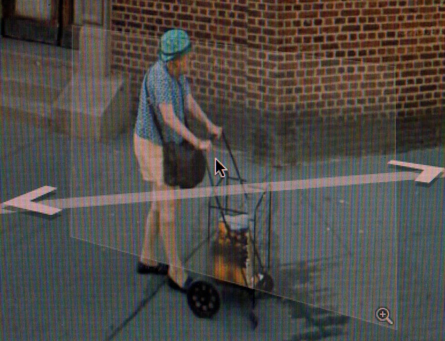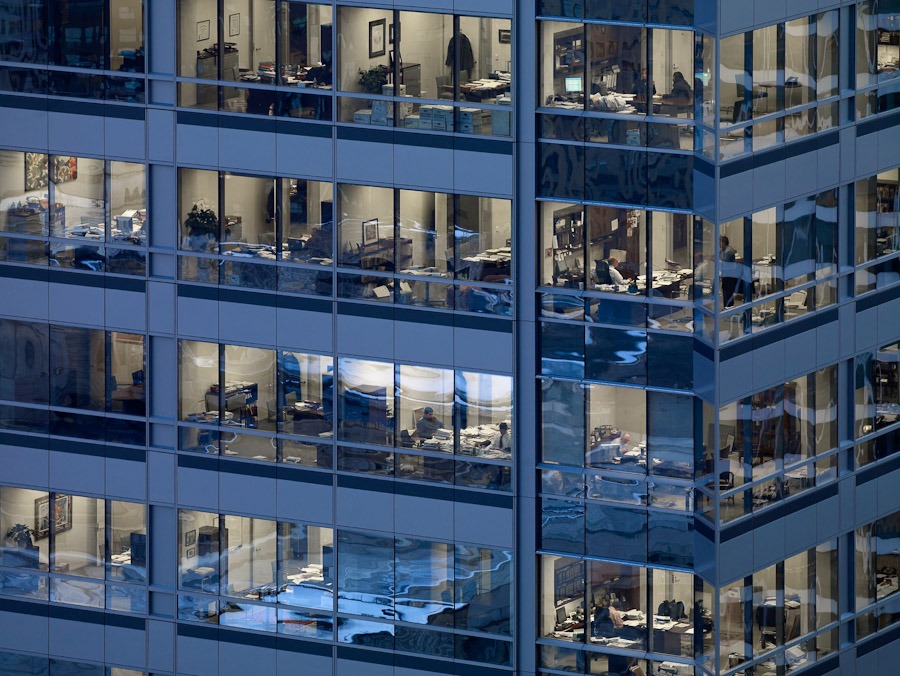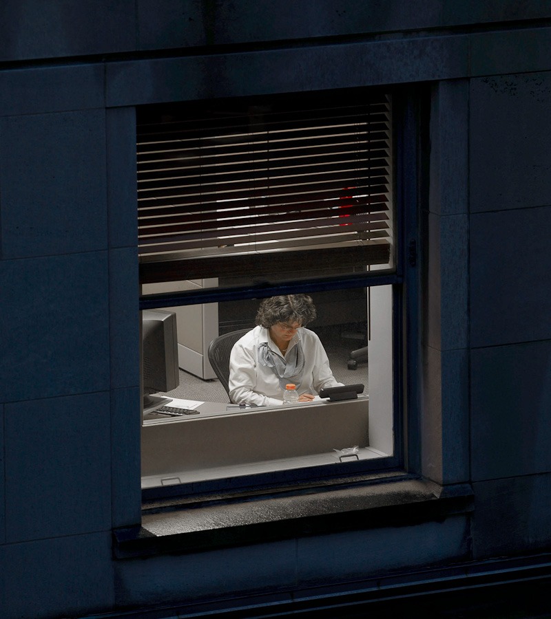 Последовательность зумов — от общей панорамы фасада до крупного кадра, где видны человеческие жесты (мужчина за столом, женщина за компьютером) — показывает, как меняется температура восприятия по мере приближения.