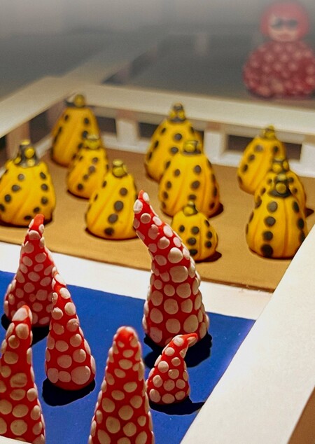Тут находятся зеркальные шары, тыквы и всё покрыто её знаменитыми горошинами, как будто попадаешь внутрь её картины.