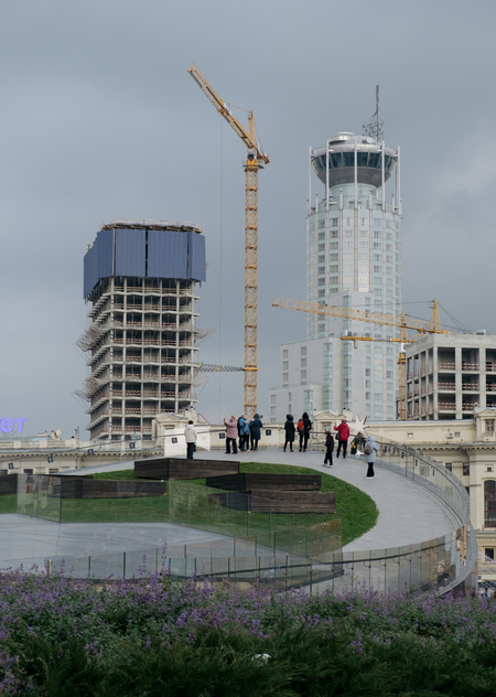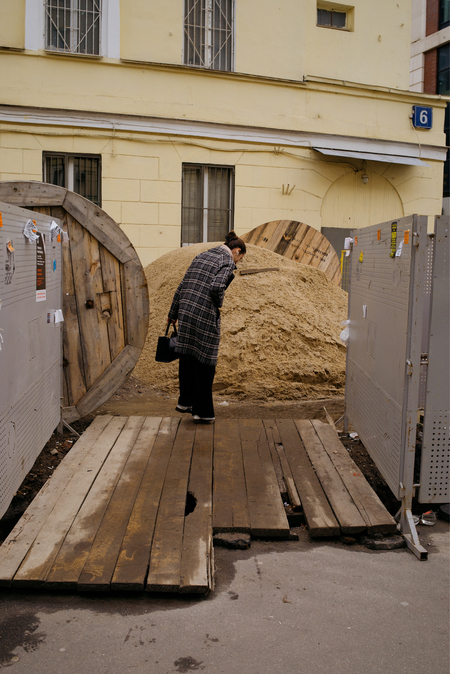 Вокруг Павелецкого вокзала Даниловский район живёт сразу в трёх эпохах. Старые дома и заводские корпуса всё ещё помнят привычный ритм прошлой жизни — здесь сушат бельё на балконах и ловят рыбу с набережной. Рядом — офисы нулевых: по утрам к ним спешат люди с кофе, а вечером тот же поток растворяется в уличном шуме. А поверх всего надвигается новая эпоха: стройка, краны, башни из стекла и бетона. Здесь уже гуляют молодые родители из новостроек, дети играют среди реклам будущих кварталов. Район не застывает — он движется, и человек движется вместе с ним.
