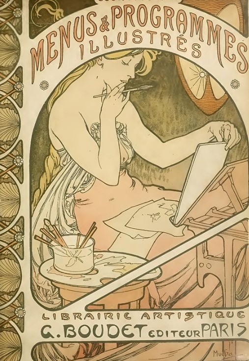 В работах Альфонса Мухи отчётливо заметны приёмы укиё-э: вытянутые вертикальные форматы, орнаменты, серийность. Его знаменитая текучая линия напрямую перекликается с линиями Хокусая и Утамаро — теми самыми, где контур не обводит объект, а задаёт ему ритм. Женские фигуры у Мухи напоминают композиции Утамаро декоративной плоскостью, чистыми пятнами и акцентом на силуэте.