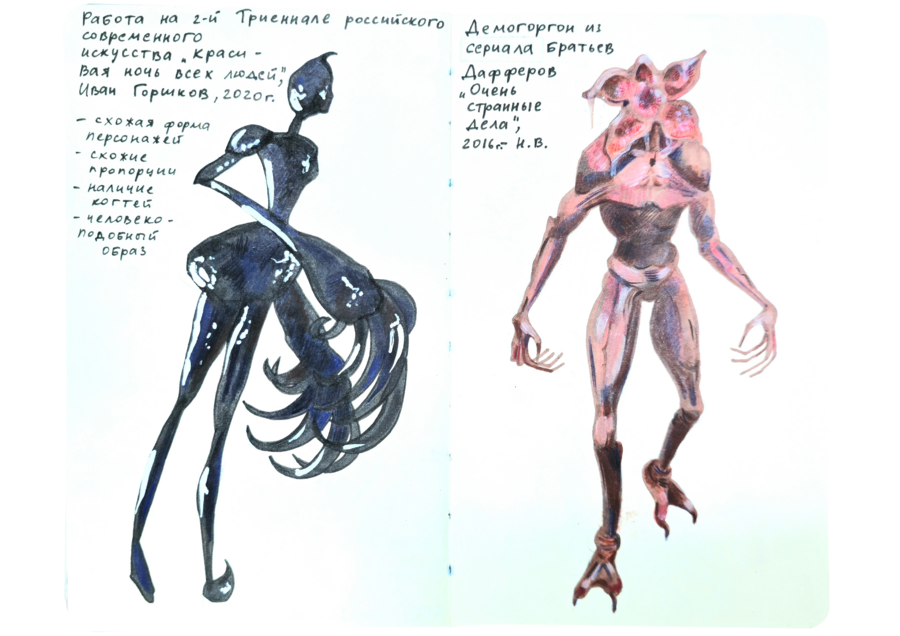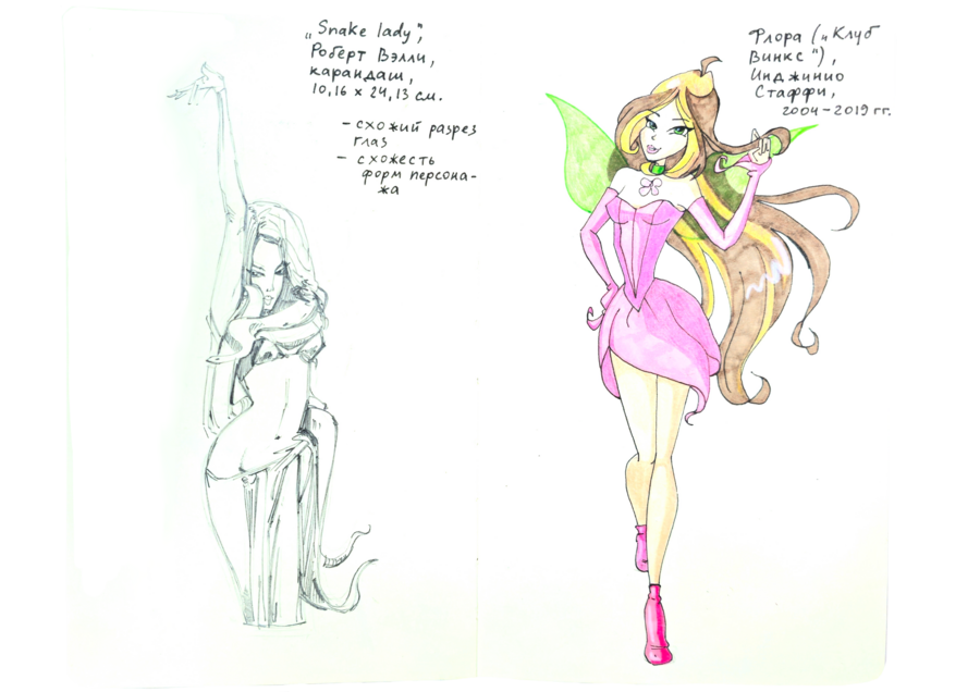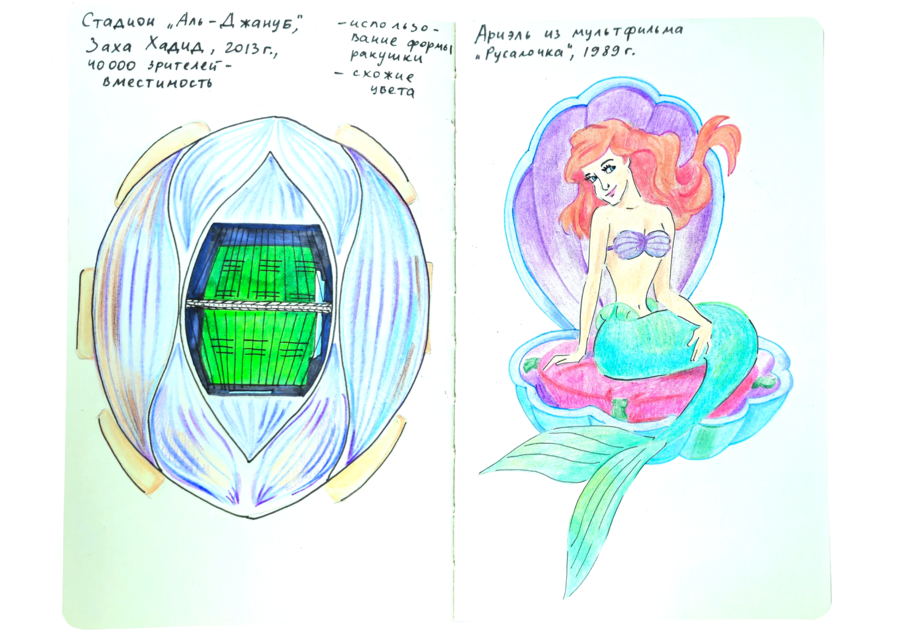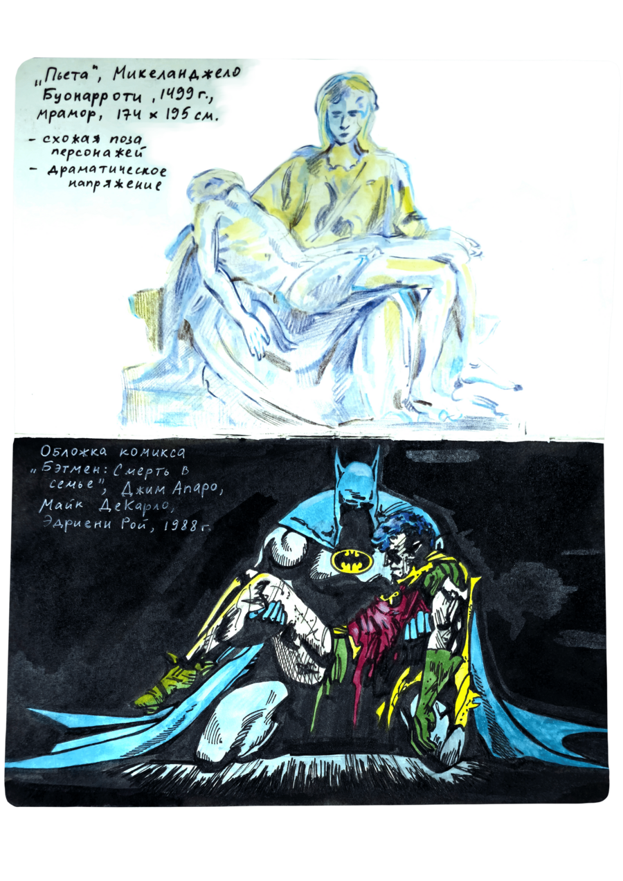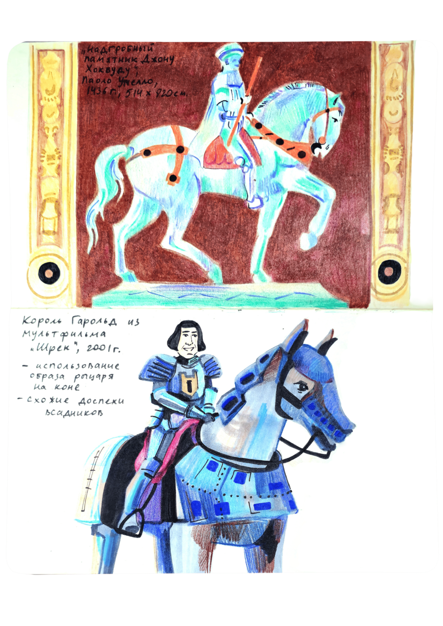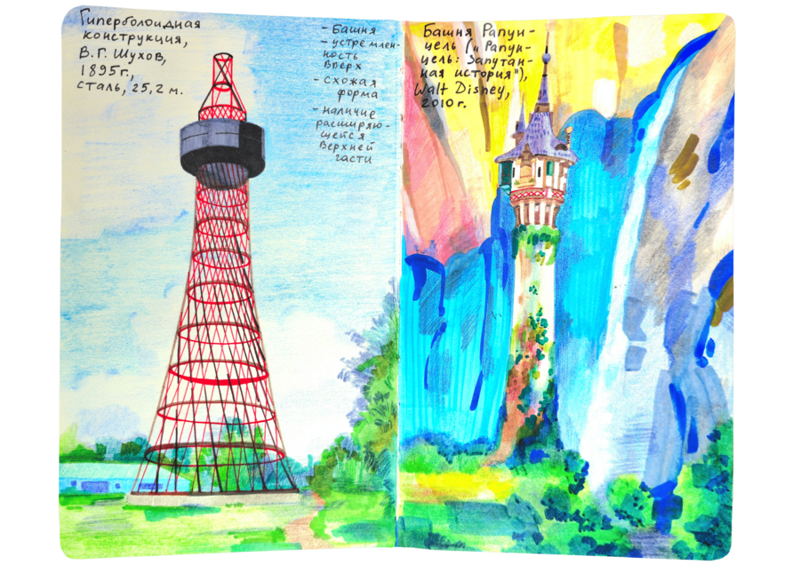 В данном визуальном исследовании нужно было подобрать пары к 25 работам предложенных дизайнеров, художников, иллюстраторов, архитекторов, скульпторов и к играм. Я старалась подобрать пару к данным творцам не из классического искусства, а, например, из массовой культуры. Таким образом мне хотелось показать, что искусство циклично и что приемы, которые использует скульптор, художник или дизайнер, могут также использоваться режиссерами и художниками-мультипликаторами.