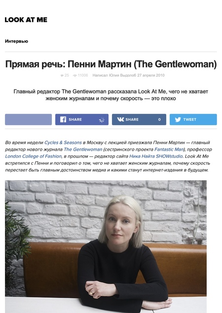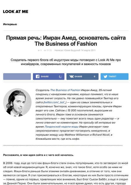 Юля: Look At Me тогда был молодой, бодрый конкурент уже подросшей «Афиши». Он был быстрее, ироничнее, со своим характером, гибче по форматам, потому что изначально это было диджитальное издание. Если «Афиша» была строго подчинена фреймам бумажного журнала, то у Look At Me был новый уровень свободы. Мы придумывали разные форматы, делали блоги в рамках Look At Me. Очень много было интервью, которые могли быть по сорок тысяч знаков, потому что мы не считали нужным их сократить — интернет все стерпит.