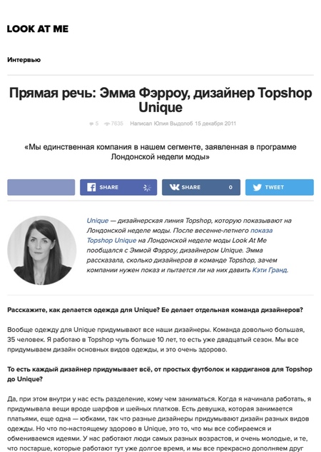 Юля: Из «Афиши» я ушла в Look At Me [Прим. АРМ: Look At Me — российский онлайн-журнал о моде, культуре и арт-сцене], где работала старшим редактором моды. Редактором была Даша Князева, которая потом стала работать в Wonderzine [Прим. АРМ: Wonderzine — российский онлайн-журнал о культуре, моде и гендерных темах]. Новостным редактором была Лиза Кологреева, которая позже переехала в Питтсбург (США) и работает над проектом, который открыли там основатели магазина SV [Прим. АРМ: Имеется ввиду московский мультибренд авангардной одежды SVMOSCOW].