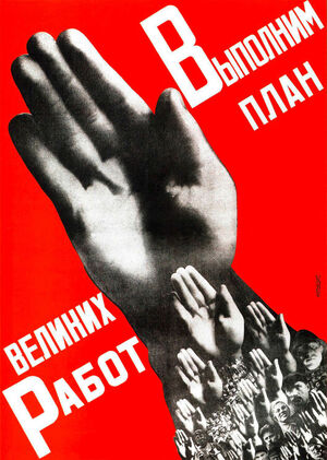 Плакат к фильму Сергея Эйзентшейна «Октябрь» (1925 г.) / Клуцис. Плакат «Выполним план великих работ». 1930