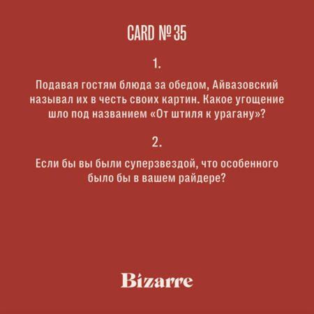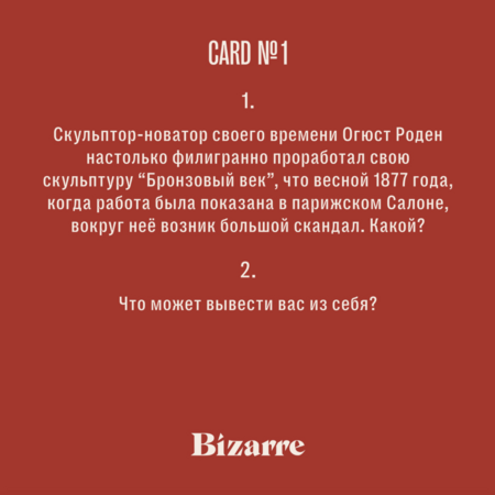 BIZARRE GAME — интеллектуально-психологическая игра, состоящая из 45 карточек с вопросами, карточек с ответами и подсказками.