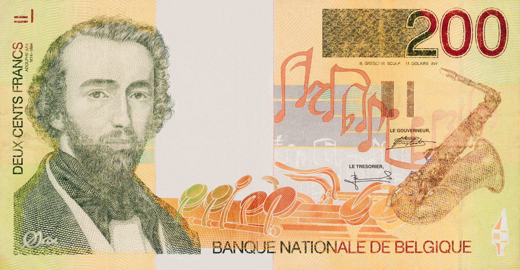 Купюра достоинством 200 франков была выпущена Национальным банком Бельгии в 1995 году. Вышла из обращения 1 января 2002 года в связи с переходом на евро. На лицевой стороне размещены портрет изобретателя саксофона Адольфа Сакса, нотные знаки и изображение самого инструмента. На оборотной стороне — силуэты трёх саксофонистов.