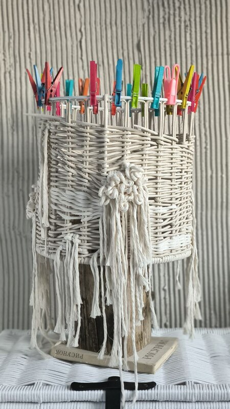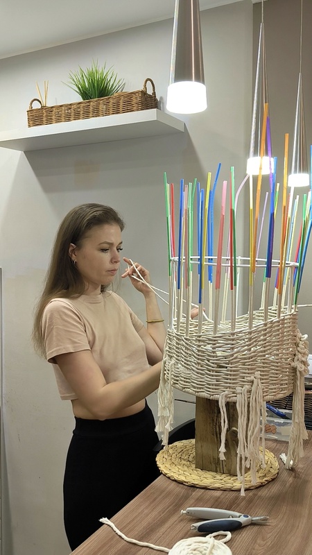 В этой работе использованы совмещенные техники и разные материалы. Абажуры выполнены в двух техниках: плетение из бумажной лозы и ткачество.