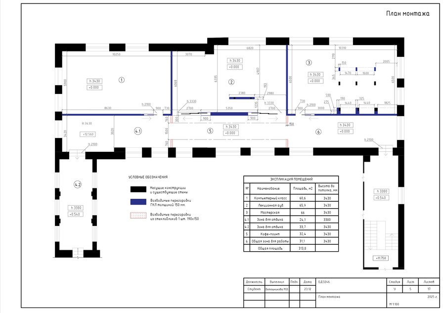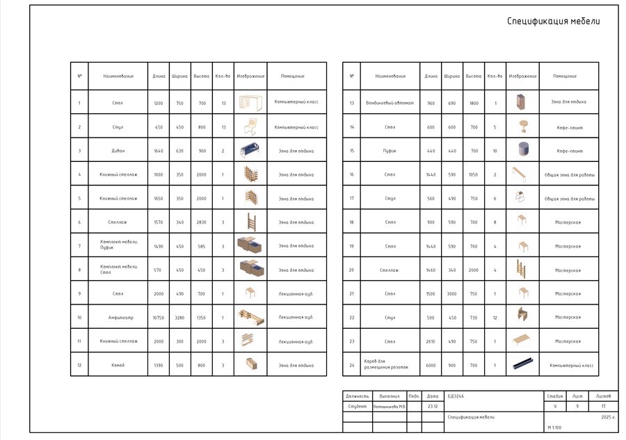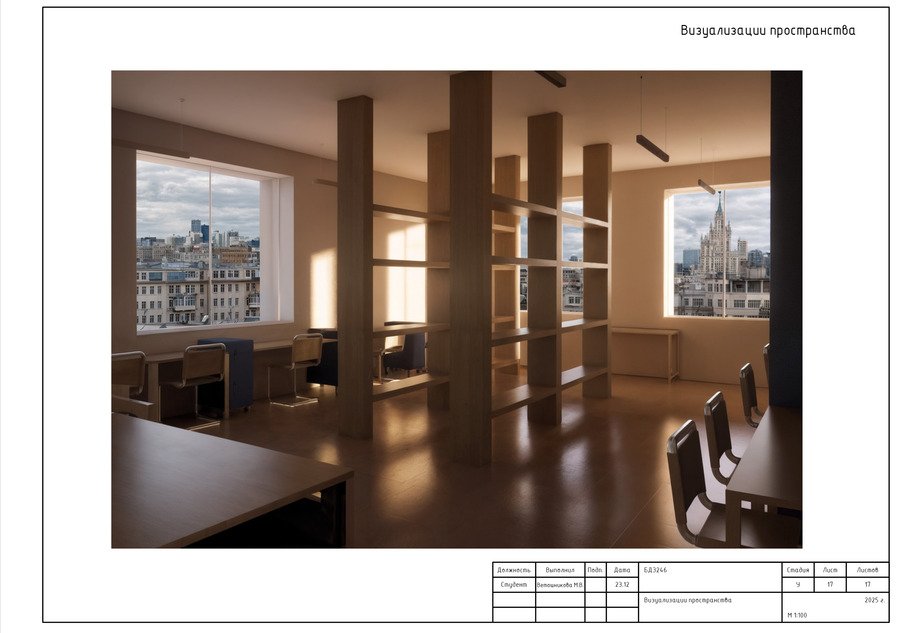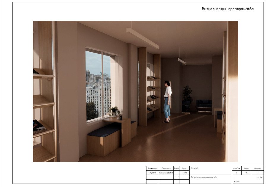 Данный проект содержит чертежи, выполненные в программе AutoCAD, и визуализации интерьера учебного кластера, разработанного в первом модуле.