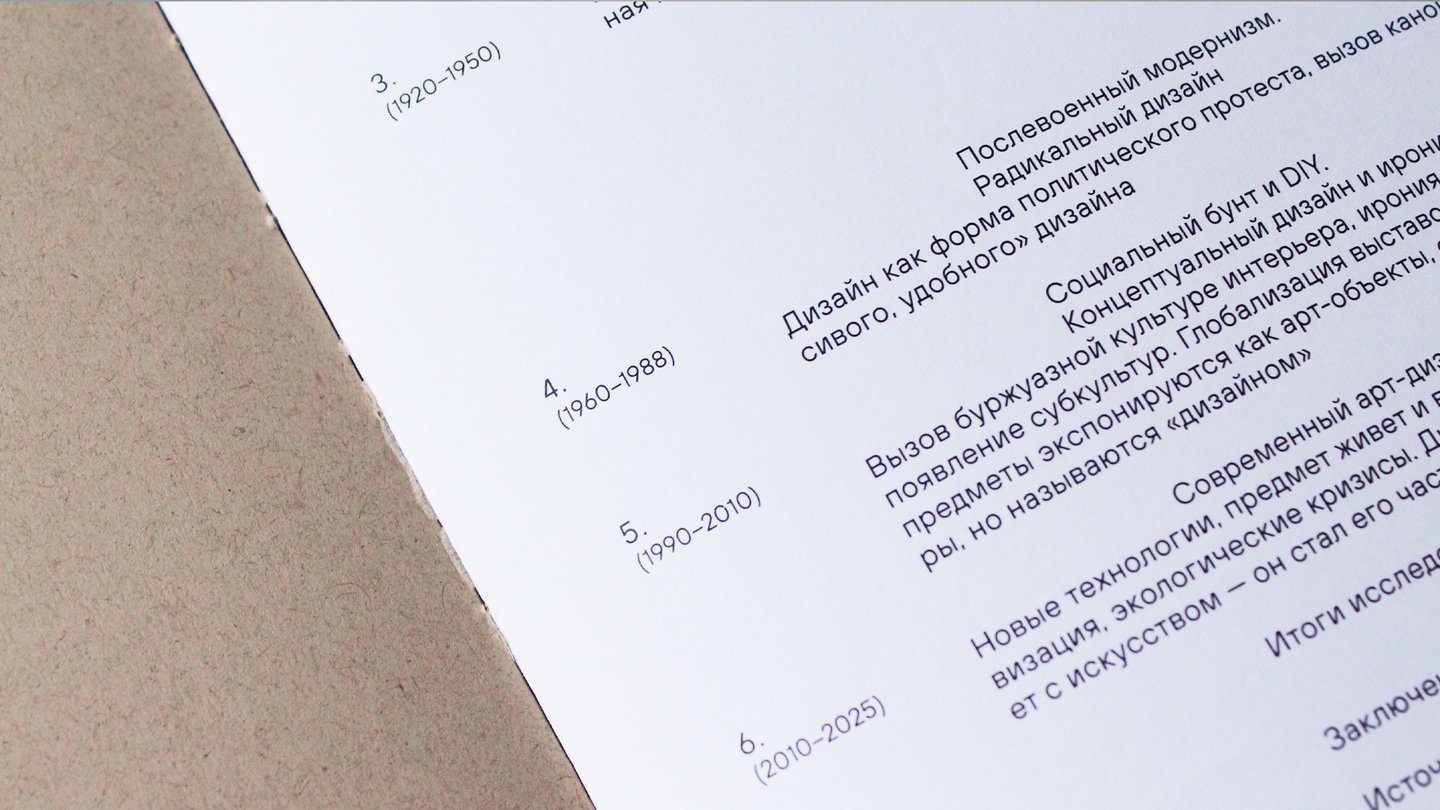 1. Введение 2. Индустриальная революция. Arts and Crafts (1860–1910) 3. Войны и кризисы (1920-1950) 4. Послевоенный модернизм. Радикальный дизайн (1960–1988) 5. Социальный бунт и DIY. Концептуальный дизайн (1990–2010) 6. Современный арт-дизайн (2010–2025) 7. Заключение