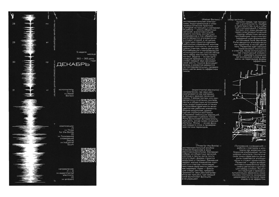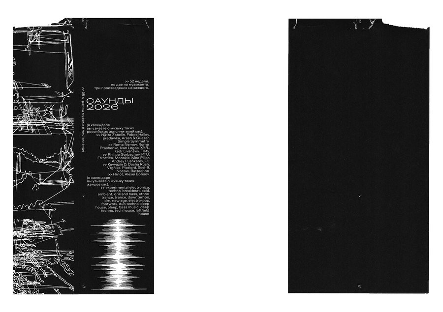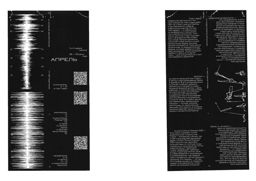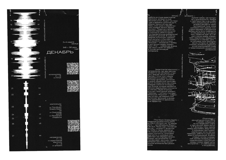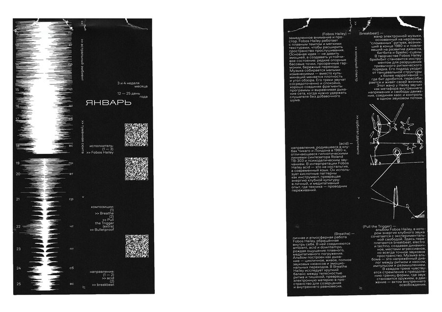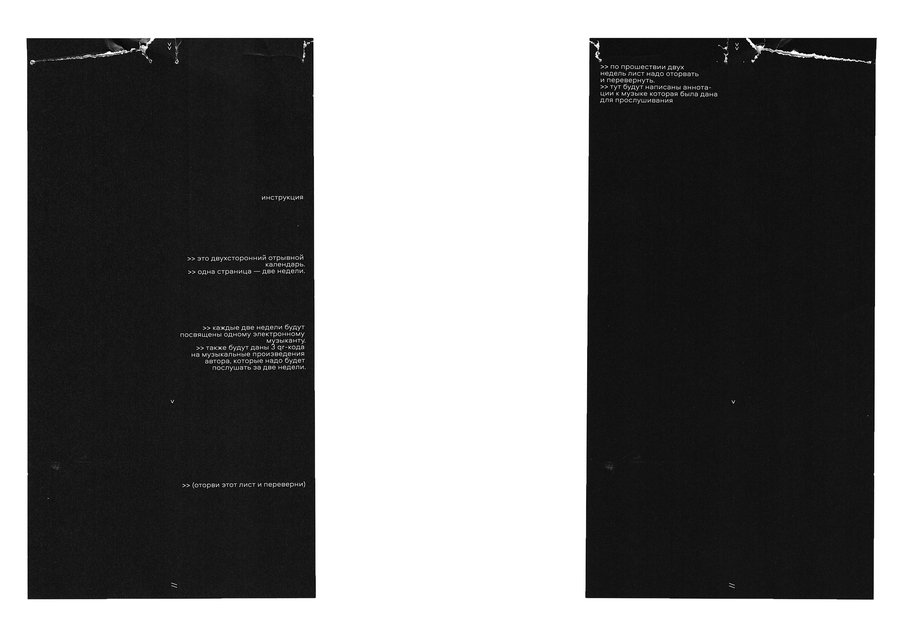 это отрывной календарь с двухнедельным шагом и двусторонними листами: на каждые 14 дней — один электронный музыкант, краткая аннотация об авторе, его музыке и ключевых жанрах.