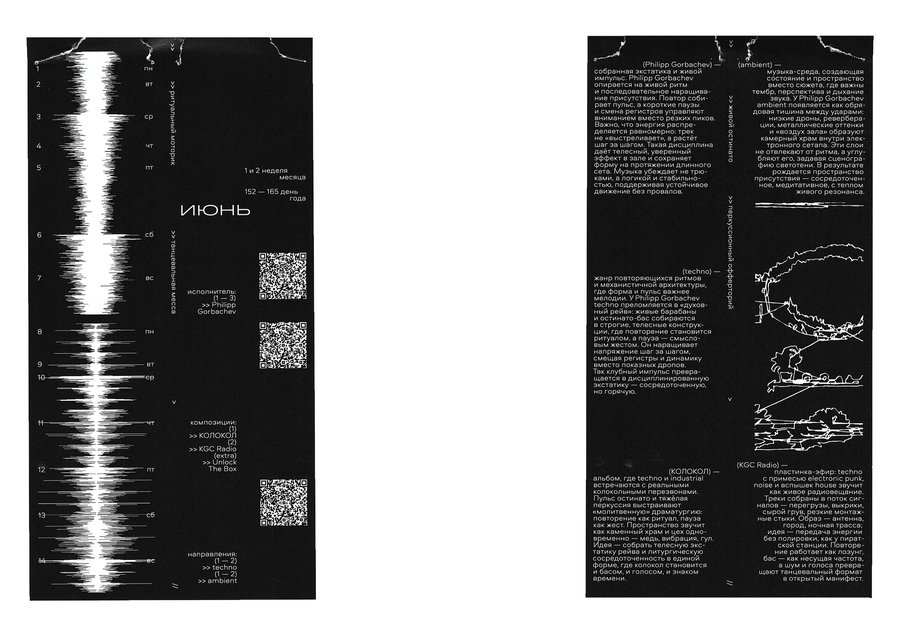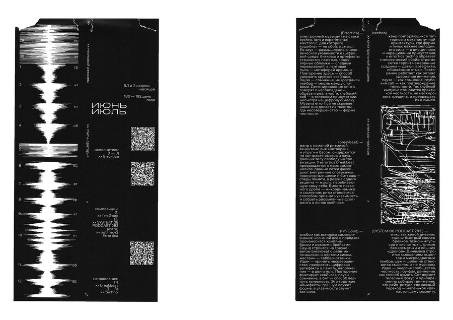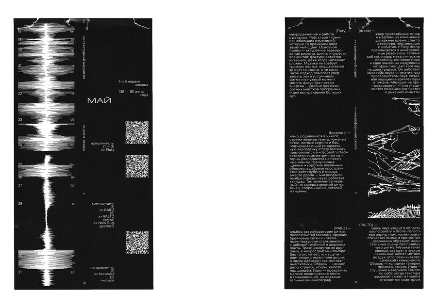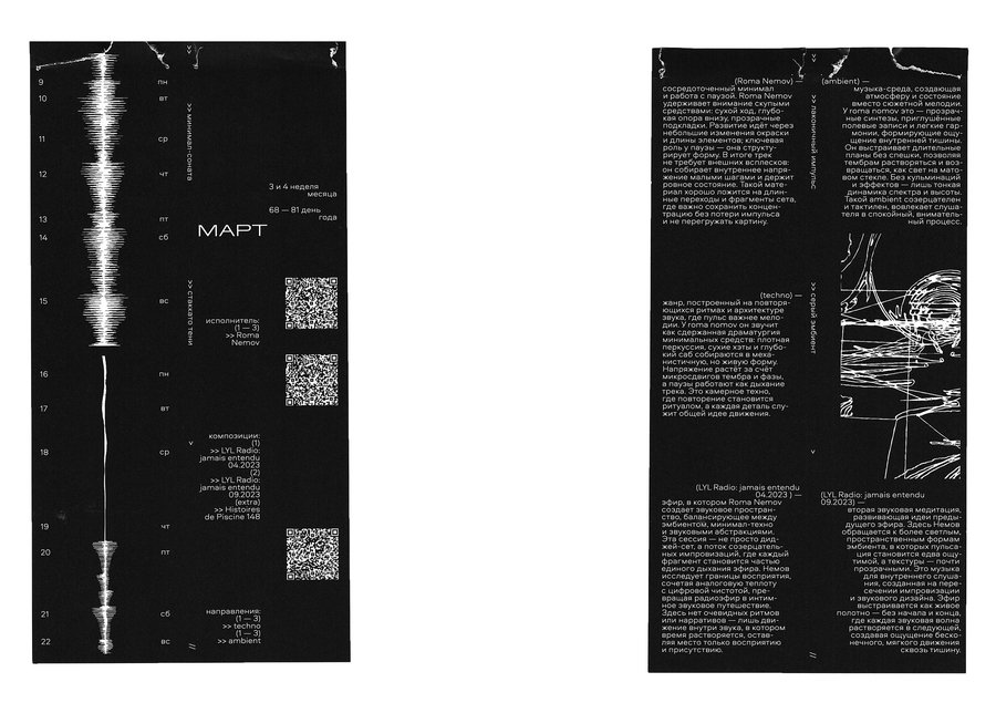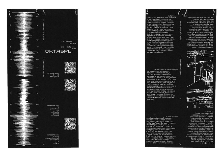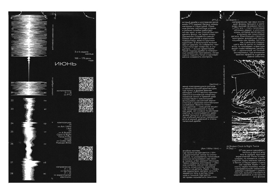 это отрывной календарь с двухнедельным шагом и двусторонними листами: на каждые 14 дней — один электронный музыкант, краткая аннотация об авторе, его музыке и ключевых жанрах.